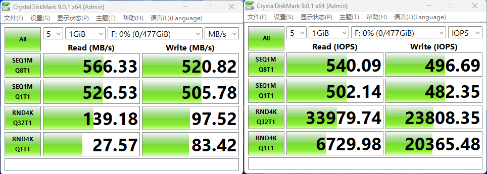 在侧重连续大文件读写的1GB 容量测试中,SC300 的顺序读取速度达到566MB/s、顺序写入 520MB/s,与官方标称基本一致。考虑到 SATA 接口的理论上限为 600MB/s,这一成绩已经逼近 SATA 3 的带宽瓶颈,也表明 EBSS1032C 主控在当前架构下能将 SATA 规格的性能潜力发挥得较为充分。