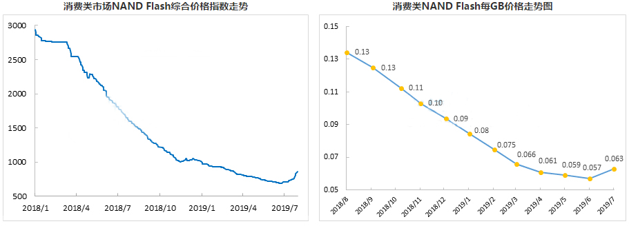 据最新消息,2019年首季市场需求清淡,NAND Flash价格持续下滑,使得大部分存储厂商首季财报表现惨淡,Q2季度存储市况依然未见好转,再加上美国在5月份针对华为出台的“禁令”对产业链产生的负面影响,截止到6月28日,2019上半年消费类NAND Flash价格指数累积跌幅高达32%,消费类每GB价格跌破0.06美金,其中SSD、eMMC等部分产品价格跌幅也超过了30%,闪存卡产品跌幅甚至高达35%。