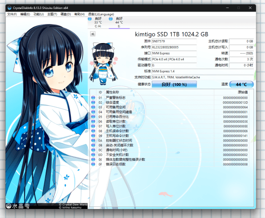 先用CrystalDiskInfo检测新品信息,显示固件为SN07579,总计读写量均为0,通电3次,支持SMART、TRIM等功能。