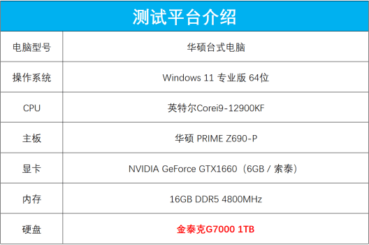 对于硬件产品,大家更关注的是其性能表现,接下来我便通过各类专业基准软件测试金泰克G7000,以上则是此次测试所用平台。