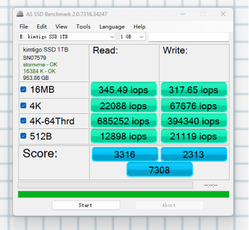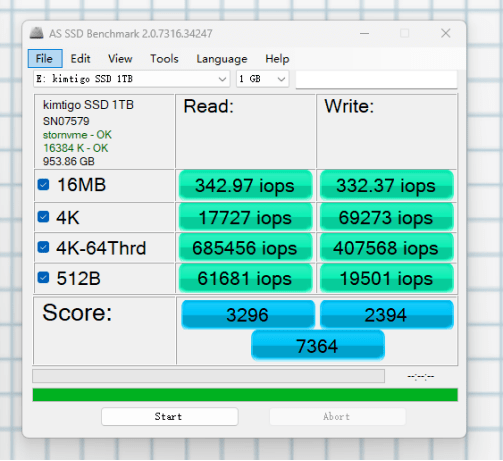 再利用AS SSD Benchmark测试金泰克G7000的4K随机读写性能,空盘状态下,64线程4K随机读写分别为685456 iops和407568 iops,总成绩为7364。