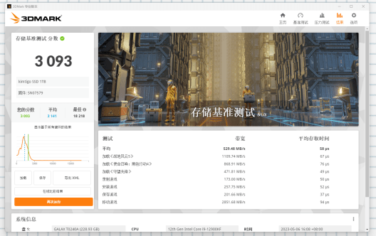 通过3DMARK的测试,金泰克G7000存储基准测试分数为3093,平均带宽为529.48MB/s,平均存取时间58μs。在一些大型游戏的加载、录制、安装中均有着不错的表现。