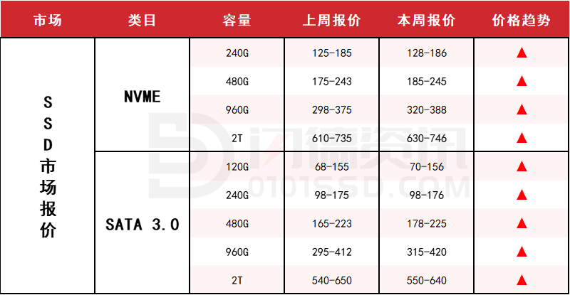 本周NVME大致报价,所有容量呈上涨态势,涨幅区间在2%-7%左右;