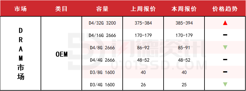 本周内存OEM市场报价,D4板块,除8G下跌1%,32G上涨3%,其它容量保持不变;D3板块,4G下跌4%,8G容量不变。