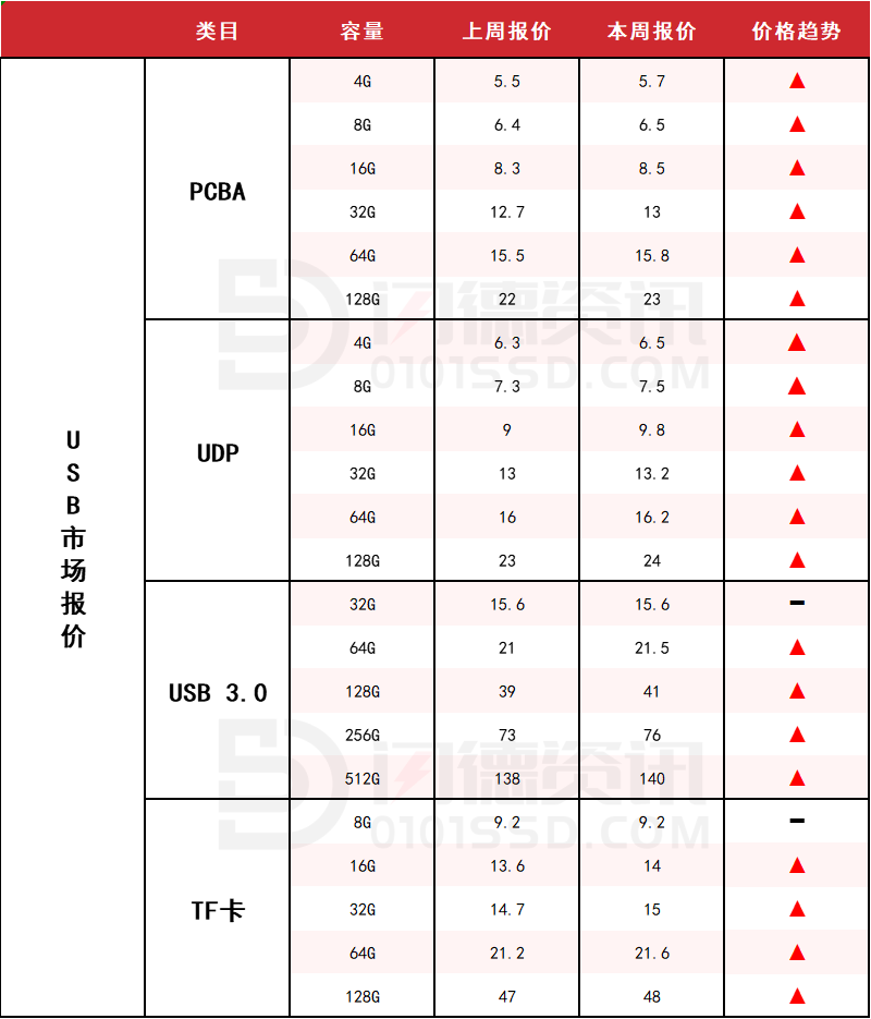 本周USB市场报价小幅上涨,需求一般,客户端基本观望对单为主。据业内人士透露,闪迪和美光短期暂无放货意愿,晶圆依旧倒挂。随着晶圆价格高涨,短期下跌的可能较小,保持底仓,流水为主。