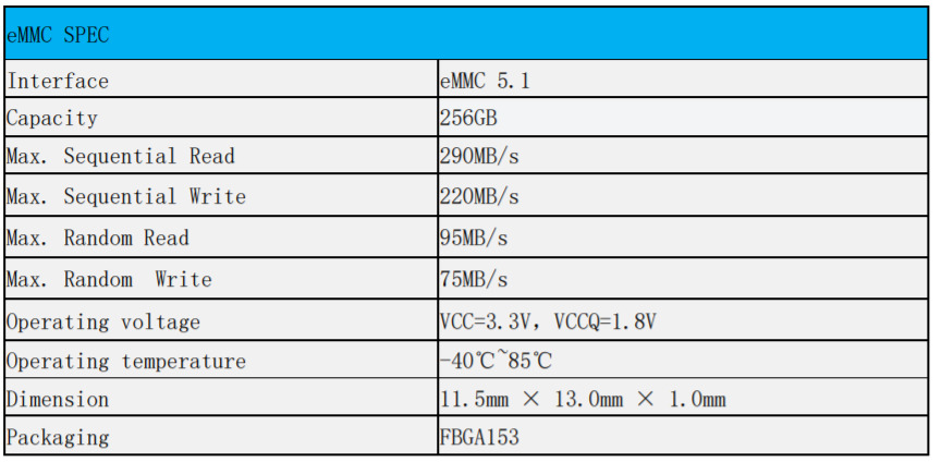 此次首发256GB eMMC产品遵循JEDEC 5.1 标准,向下兼容至4.51标准,支持HS400模式,读写性能分别达到290MB/和220MB/s,并支持HOST端TRIM和CACHE功能。