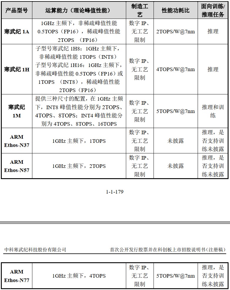 与 ARM 最新一代的 AI 芯片 Ethos-N77 产品相比,寒武纪 1M 也达到 7nm 工艺,二者在性能功耗比方面也相同。在运算能力方面,寒武纪 1M 单核理论峰值(INT8)在 1GHz 频率下可达 8TOPS(TOPS 为处理器运算能力单位,1TOPS 代表处理器每秒钟可进行一万亿次操作),高于 ARM 前述产品(4TOPS)。在任务支持方面,寒武纪 1M 可同时支持推理和训练功能,而 ARM 在推理功能之外是否支持训练未进行披露。