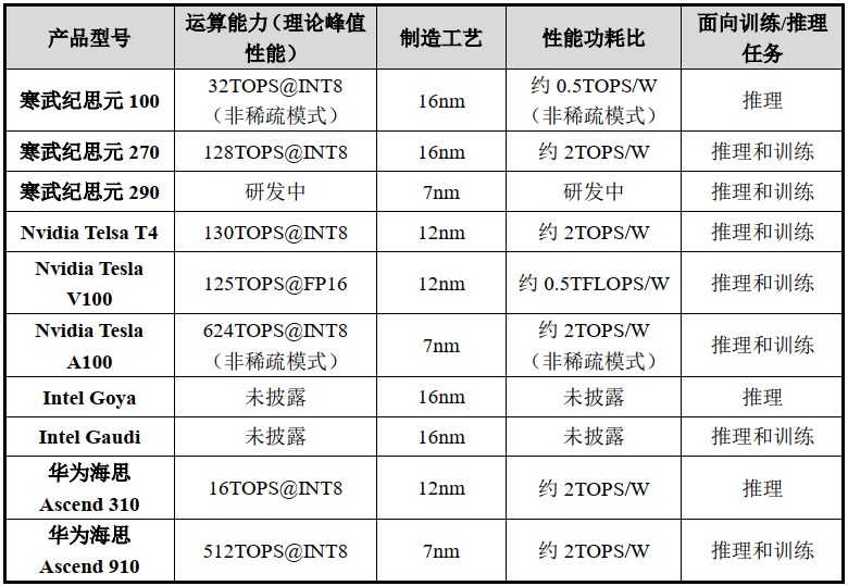在边缘端,寒武纪于 2019 年 11 月推出了 16nm 工艺的思元 220 及加速卡,与英伟达和华为海思均可进行 AI 推理任务,运算能力上低于英伟达,且制造工艺也相对落后。在性能功耗比上,寒武纪和华为海思均高于英伟达,但在市场认知度上,英伟达亦在全球占据领先地位,寒武纪和华为海思产品则还处于市场开拓期 。
