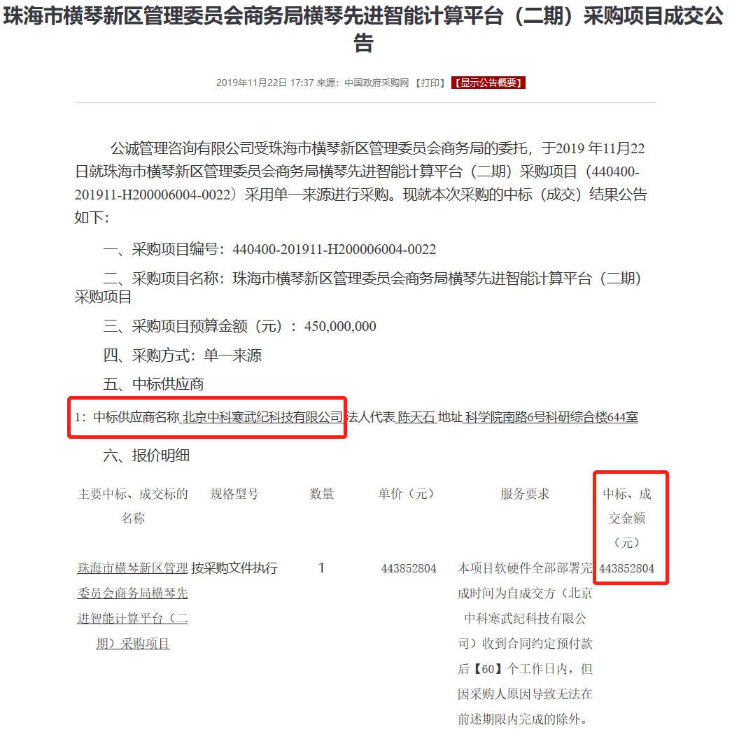 据中国政府采购网,该项目二期预算金额 4.5 亿元,寒武纪作为唯一供应商中标近 4.44 亿元。公开信息显示,横琴先进智能计算中心项目计划总投资 20 亿元,2022 年还会进行第三期扩建。这意味着寒武纪仍可以在未来几年在该项目上躺着数钱,但其表示,除该订单以外,公司暂无其他订单,业务来源稍显单一。