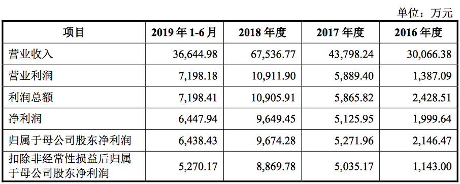 据招股书披露,嘉兴斯达2016年、2017年、2018年、2019年上半年营收分别为30,066.38万元、43,798.24万元、67,536.77万元、36,644.98万元;同期对应的净利润分别为1,999.64万元、5,125.95万元、9,649.45万元、6,447.94万元。