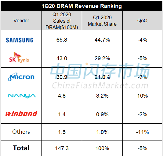 三星一季度DRAM营收环比下滑4%至65.8亿美元,但其市场份额仍位列第一;