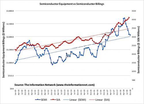 不过,自2011年以来,半导体行业和半导体设备行业营收之间的关联性开始下降。如图2所示,红线所示的半导体行业收入增长不断,而半导体设备收入自2018年6月以来就掉头向下,急剧下降。
