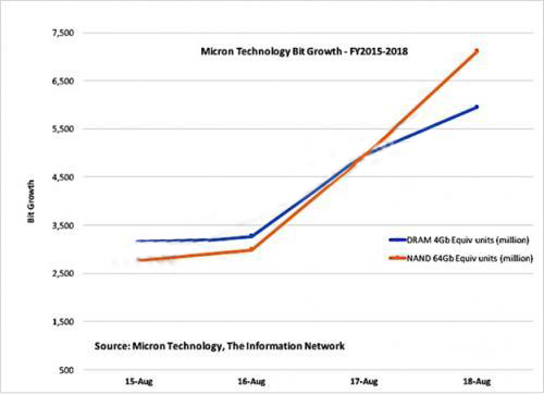为了抵抗这种“自然衰退”,需要增加相应的产能,这可以通过建设新的晶圆厂,部署新的生产线和购买生产设备来实现。所以,2017年半导体设备采购量增加了60%虽然没有导致单位出货量的同比例增长(图3),但是按照比特计算的增长幅度相当可观(图4)。