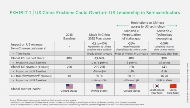 BCG报告根据美国采取措施的不同,进行了建模分析,来预测美中国半导体产业面临的情况和全球半导体行业格局变化。