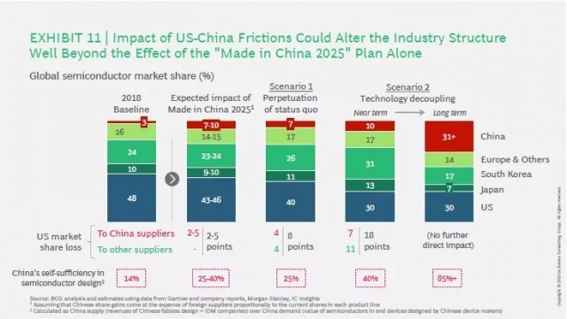 报告预计,中国供应商将获得美国产业损失收入的约一半,中国半导体设计的自给自足性从14%提高到25%;美国半导体公司损失的另一半收入将流向欧洲或亚洲的替代供应商口袋中。