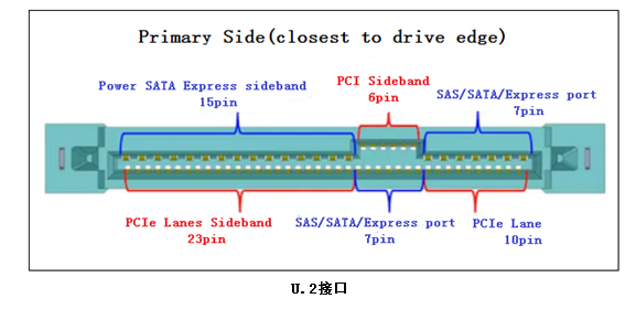 4、 U.2接口:最初的名称是SFF-8639,在2015年的台北电脑展上改名为U.2,产品形态为2.5inch,支持PCIex4,所以PCIe Gen3x4速度可达4GB/S。U.2目前还是新兴产品,主要适用于工作站和服务器领域的企业级市场。