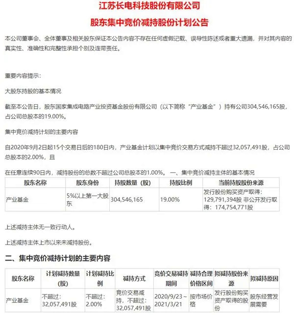 9月1日晚间,长电科技公告称,股东国家集成电路产业投资基金股份有限公司(简称“大基金”)计划以集中竞价交易方式减持不超过3205.75万股,占长电科技总股本的2%。