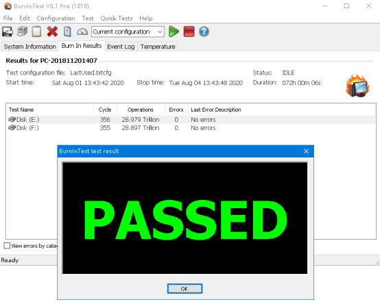然后使用PassMark BurnInTest软件进行满载连续读写测试,在测试开始时,同时启动高低温试验箱程序。BurnInTest可以对硬件进行全面的检测,帮助检验超频后系统的稳定性,并发现潜在隐患。
