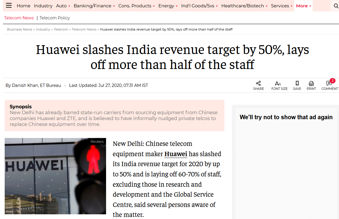 据印度经济时报报道,数名知情人士表示,中国电信设备制造商华为已将其2020年度在印度的收入目标下调50%之多,并计划裁员60%-70%,不包括研发和全球服务中心的员工。