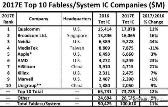 2017 年全球前十大Fables s IC 设计厂商(百万美元)