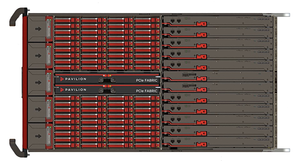 这家位于圣何塞的初创公司开发了RF100全闪存阵列,该阵列的结构类似于具有多达10个控制器的网络交换机。与使用传统双控制器阵列架构的典型全闪存阵列相比,这是完全不同的方法。Pavilion控制器基本上是线卡,每个控制器都包含四个以太网端口-40Gbit / s或100Gbit / s。