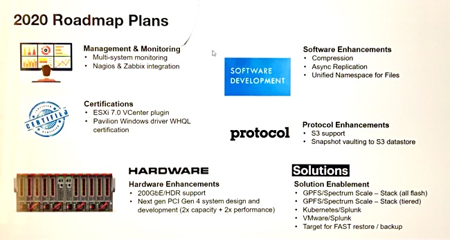 在硬件方面,Pavilion工程师正在为2021年开发基于PCIe gen 4的系统。PCIegen 4的速度是当前PCIe gen 3总线的两倍,其目的是升级运行速度将是当前硬件的两倍,平均访问延迟为40微秒,IOPS为2000万。该系统还应以2PB有效容量保存两倍的数据。