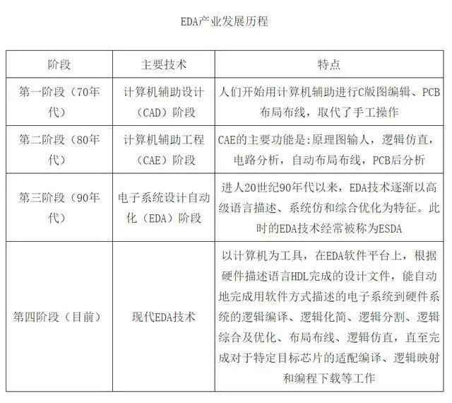 整个芯片制造过程,需要EDA的环节很多,通常有四大类EDA工具,咱们先来看下发展历程(如图)。