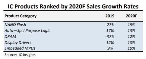2018-2019 年,由于市场低迷及产能过剩,存储芯片价格持续走低,在经历了近两年的价格下行周期后,2019 年底稍有回暖迹象。IC Insights 发布的《McClean 报告 2020》预测,2020 年成长最快 IC 产品中,NAND Flash 排在第一,预计增幅达 19%。
