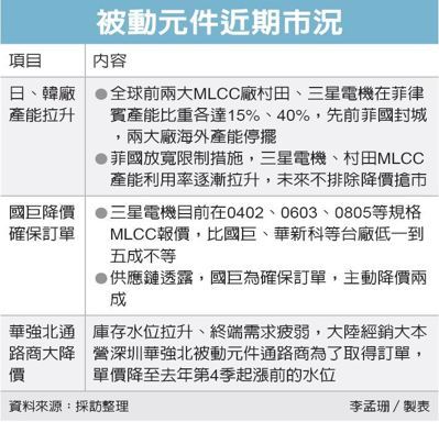 尤其,三星电机菲律宾产能恢复后积极抢市,报价也明显比国巨等台厂低。供应链指出,三星电机目前在0402、0603、0805等规格MLCC报价,比国巨、华新科低一到五成不等。