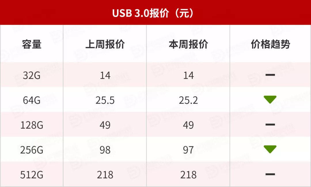 USB 3.0板块,现货报价除了64G和256G容量下跌,跌幅在1%左右,其他容量报价保持不变。