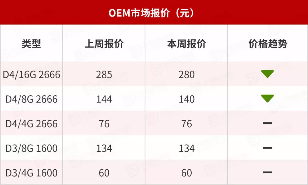 内存OEM本周市场报价,D4方面,全容量呈现下跌姿态,跌幅区间在1-2%,D3方面,报价保持和上周持平。