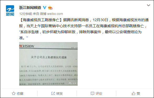 浙江新闻频道官方微博也转发了上述消息。根据通报,坠楼事件发生后,海康威视第一时间通知120急救,并向110报警,相关部门及公司主管人员迅速到场。经120医生现场确认,坠楼人员已身亡。