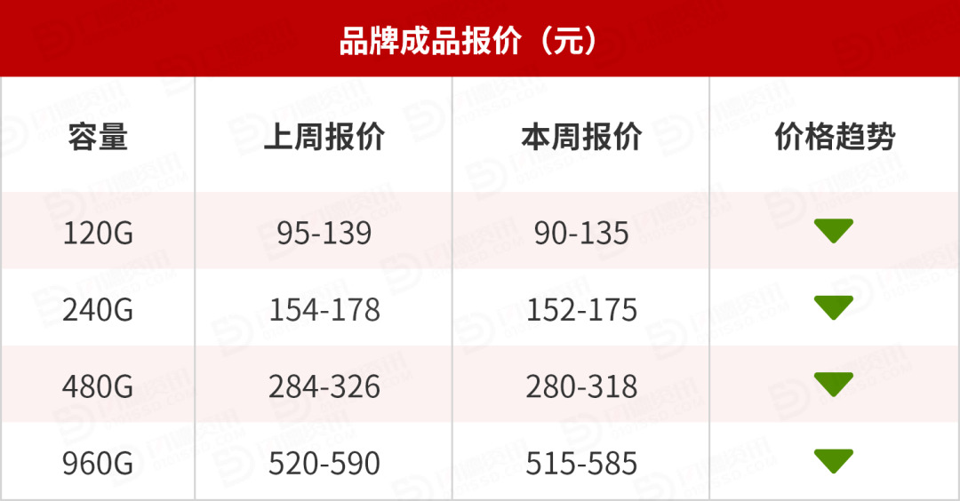 本周品牌大致报价,所有容量呈现下跌态势,跌幅区间在1-5%。