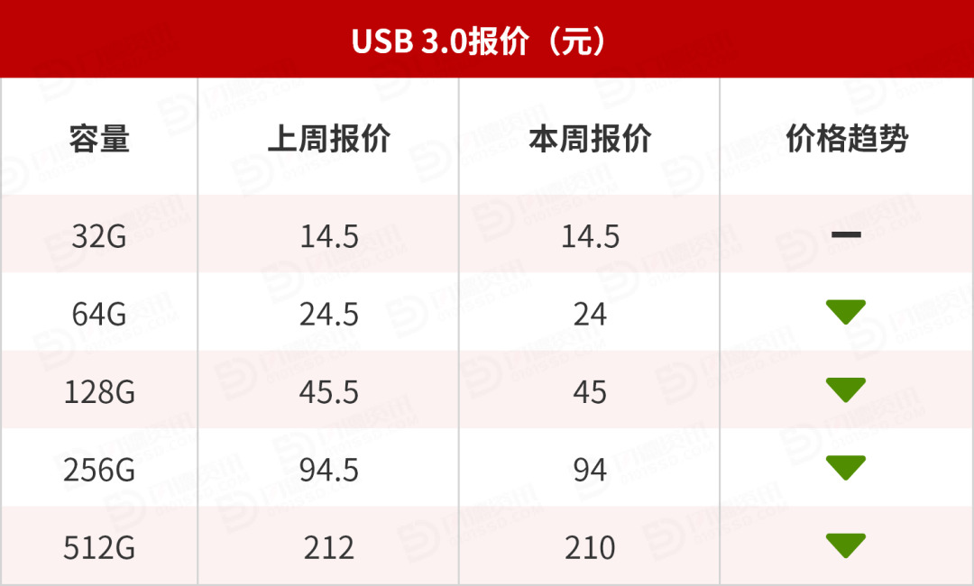 USB 3.0 半成品现货大致报价,除了32G容量保持不变,其它容量呈下跌态势,跌幅区间在1-2%。