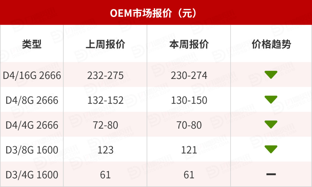 内存OEM本周市场报价:D4板块,所有容量呈下跌趋势,跌幅区间在1-3%, D3板块,除了4G容量保持不变,8G容量下跌近2%。