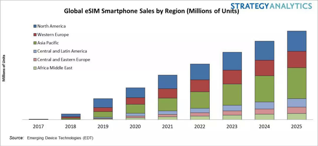 (按地区分列的全球eSIM智能手机销售,来源:Strategy Analytics)
