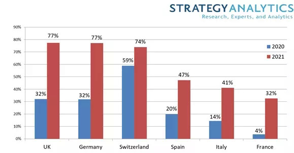 Strategy Analytics副总监Ville-Petteri Ukonaho说:“就数量而言,中国和美国在5G智能手机销售方面处于领先地位。但是在西欧主要市场,消费者正在迅速采用5G智能手机。瑞士,德国和英国是5G的领导者,占2020年智能手机总销量的份额。”