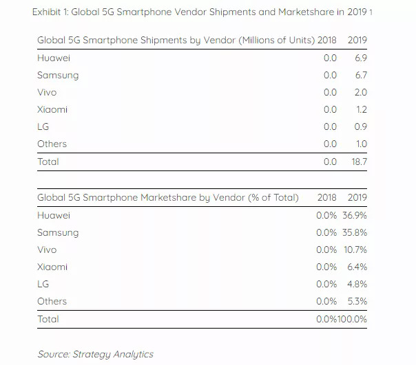 小米在欧洲大有斩获,同时维持在印度智慧型手机市场的龙头地位,然而根据Strategy Analytics资料显示,小米2019年全球出货了120万部5G智能手机,排名第四,占据了6%的市场份额。小米通过流行的机型(如Mi Mix 3 5G)在西欧悄然取得进展,并与来自瑞士,英国和其他地方的运营商合作。