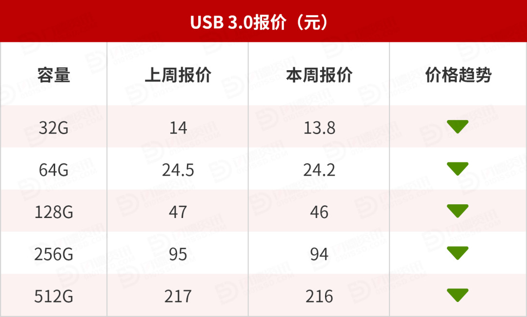 USB 3.0半成品现货板块,全容量报价微跌,跌幅区间在1-2%;