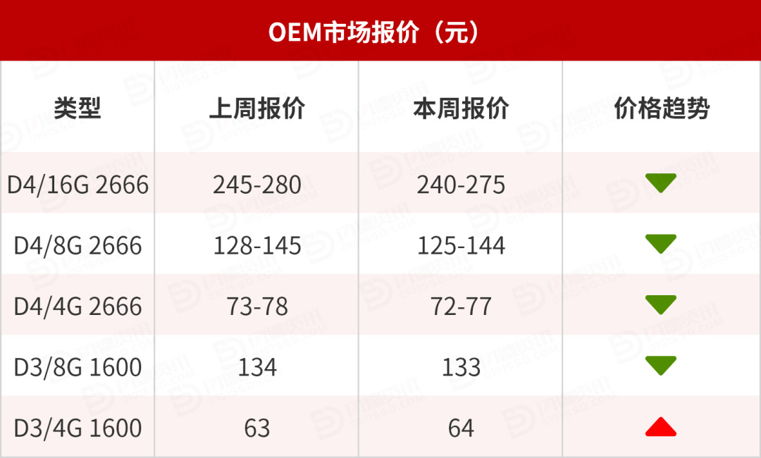 本周华强北市场需求量一般,现货除D3拆机颗粒供应较为紧张外,其它正常,D4整体缓跌,暂无起色,管住手,等待时机!