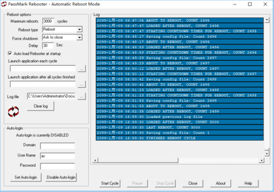 在PassMark Rebooter中选择Reboot重启测试,设定自动登陆和测试循环次数3000次,