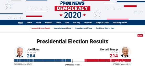 即便川普拿下了几大关键洲,威斯康辛州和密歇根州的临时反扑,让拜登反超,距离获胜仅差6票。