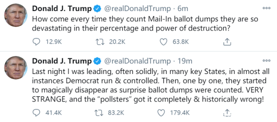 随之而来的,川普发了两条推特,表示“昨晚,我几乎在所有关键的州,在几乎所有民主党运行和控制的情况下都牢牢地领先。然后,一个接一个,随着意外选票被统计,它们开始神奇般地消失。这很奇怪,并且那些‘民调专家’完全搞错了,历史性的错误!”