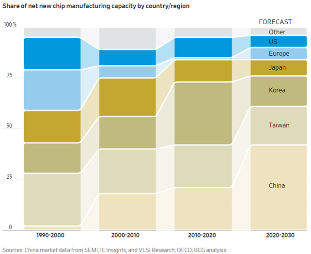 1990年时,美国和欧洲生产了全球四分之三以上的半导体。然而现在,他们的产量总和还不到四分之一。在这个过程中,中国、日本以及韩国已经崛起,正将美欧挤出市场。到2030年,中国有望成为世界上最大的芯片生产国。