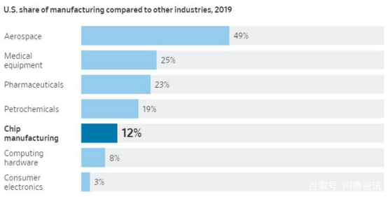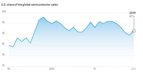 不过,其他美国大型芯片公司已将所有生产外包给亚洲生产商,比如总部位于加州圣克拉拉的英伟达,该公司是美国市值最高的半导体公司,其芯片主要在美国以外生产。截至2019年,美国公司的半导体销售份额约占全球47%。