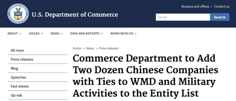 据此前报道,美国商务部工业和安全局(BIS)当地时间5月22日宣布,将24家总部设在中国、中国香港和开曼群岛的政府机关和商业组织列入实体清单,给出的理由是,这些机构威胁美国国家安全,所使用美国的商品和技术,存在被用于军事项目的重大风险。此外,BIS还宣布将中华人民共和国公安部法医科学研究所以及另外8家公司列入实体清单,即此次被列入实体名单的公司或政府机构共33家。