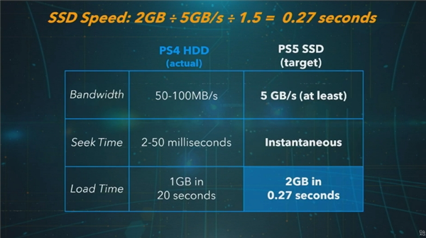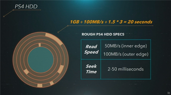 PS5唯一能在硬件上超过微软XSX主机的当属磁盘系统,尽管定制的SSD硬盘容量只有825GB,不如XSX的1TB容量,但是索尼在这上面花费的心血不少,发布会1小时内容有1/3时间都在讲SSD