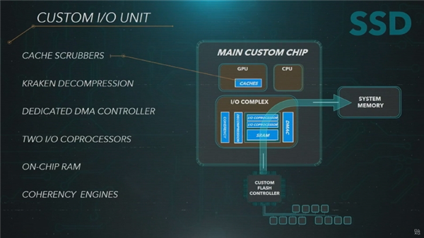 但是9GB/s的速度还不是最高水平的,PS5支持了Karken压缩技术,还有2个IO协处理器,支持DMA主控,并有片上内存,以及一致性引擎,这样做的后果就是让内存SSD之间跑出22GB/s的超级带宽。