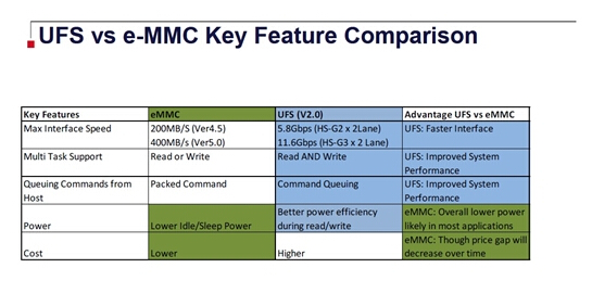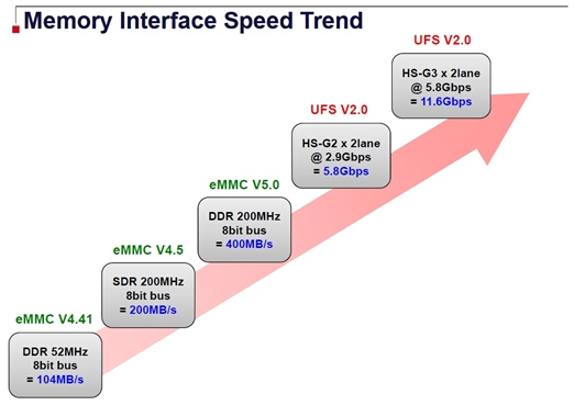 智能手机、平板机的存储介质目前以eMMC/eMCP为主流存储方案,eMMC将主控制器、NAND Flash颗粒整合到了一个小的BGA封装内,有效的解决了NAND Flash管理问题。随着市场的发展,技术的进步,速度也不断提升:eMMC 4.41 104MB/s、eMMC 4.5 200MB/s、eMMC 5.0 400MB/s,而下一代规格将由UFS 2.0接棒。