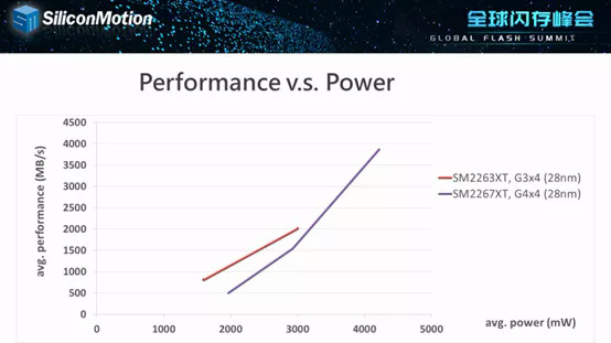 除开散热问题,PCIe Gen4 SSD产品的功耗情况对于笔记本用户而言同样不容小觑。PCIe Gen3的SM2263XT主控芯片在平均耗电达到3000mW时,平均性能可以达到2000MB/s,而同为28nm制程工艺的PCIe Gen4 SM2267XT主控芯片在同样功耗下的平均性能为1500MB/s,在4000mW平均功耗时,则是能够达到3500MB/s。